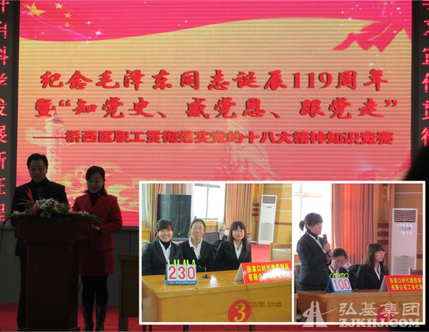 2012年12月26日下午,中共张家口时代橡胶制品有限公司总支委员会组织党员及入党积极分子参加了桥西区总工会举办的纪念毛泽东诞生119周年暨“知党史、感党恩、跟党走”——桥西区职工贯彻落实党的十八大精神知识竞赛。通过预赛、决赛取得第三名的好成绩。