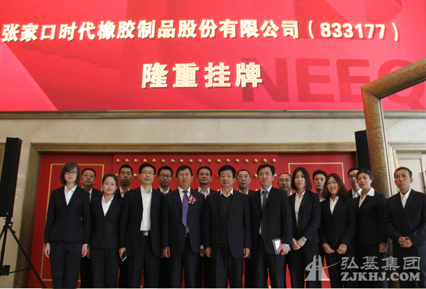2015年11月3日上午,张家口时代橡胶制品股份有限公司在北京金融街金阳大厦隆重举行了新三板挂牌仪式,证券简称:时代股份,证券代码:833177。 张家口弘基实业集团董事长兼总裁张海,张家口时代橡胶制品股份有限公司董事长张阁,张家口市副市长吴晓辉,市金融办主任刘河,北京化工大学教授国家973项目首席科学家张立群,市发改委主任申全民,张家口市万全县县长杜平,市工商局常务副局长李国华,市工信局副局长李红讯,西部证券股份有限公司北京第一分公司董事总经理赵玉,市产业集聚区管委会副主任宋振华等领导共同出席时代股份的挂牌仪式。 吴晓辉副市长代表张家口市委、市政府,对时代股份在新三板挂牌表示祝贺,对全国中小企业股份转让系统的大力支持表示感谢。同时指出,全国中小企业股份转让系统是我国资本市场体系的重要组成部分,在我国资本市场改革发展中占有重要地位。希望时代股份充分利用好新三板这一平台,认真履行信息彼露义务,加强科学规范管理,以优异的业绩回报社会、回报广大投资者。 张阁董事长代表时代股份全体员工向各位领导、各位来宾的到来表示衷心的感谢。张董在仪式上表示,能成为张家口市在新三板挂牌的企业,主要得益于张家口市良好的发展环境、完善的配套政策,得益于张家口市各级领导各部门的关心、关怀和支持,也应该感谢张家口市金融办对挂牌上市工作的细心指导。对我们来说,今天的挂牌只是一个新征程的起点,公司一定要紧跟国家产业政策,一心一意谋发展,齐心协力奔未来,争取为张家口市的经济腾飞做出新的、更大的贡献。 10:52分,张家口弘基实业集团董事长兼总裁张海、张家口市副市长吴晓辉、市金融办主任刘河、北京化工大学张立群教授、市发改委主任申全民、张家口市万全县县长杜平、市工商局常务副局长李国华、市工信局副局长李红讯共同敲响开市宝钟,见证了这一里程碑式的重要时刻。 挂牌仪式结束后,嘉宾和领导一同观摩了全国中小企业股份转让系统场外市场博览中心和挂牌企业展示中心。