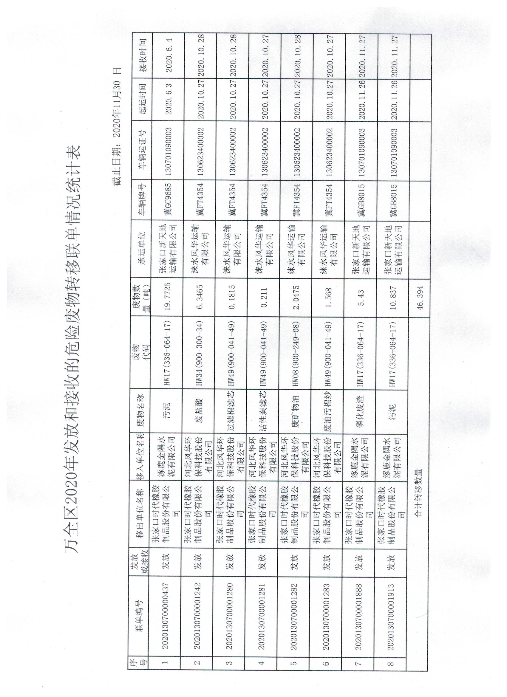 2020年危废转移联单统计表
